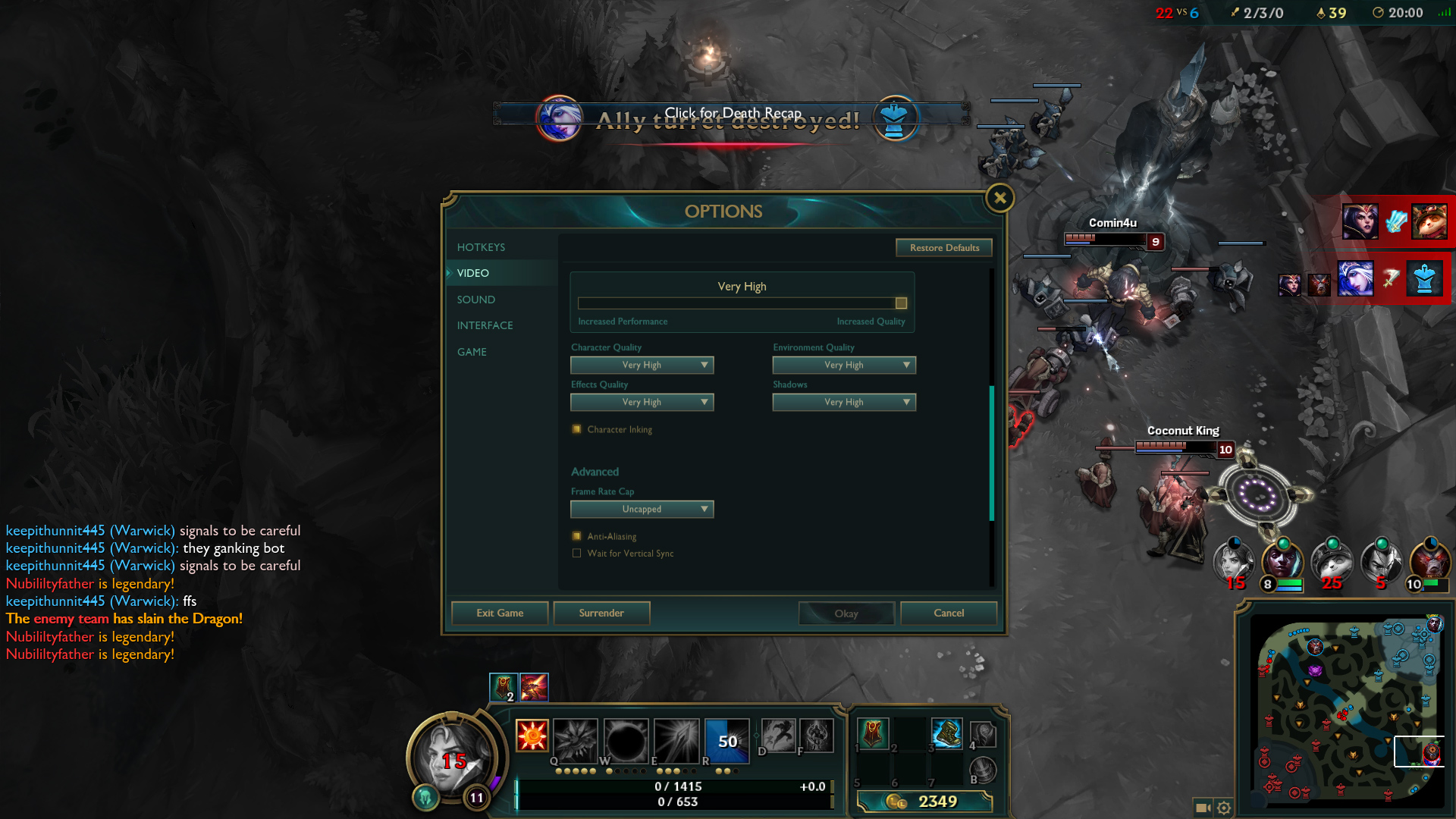 Extreme graphical quality took a noticeable toll on performance. During the calmer phases of matches the frame rate remained steady at 60 frames-per-second, but this number dropped sharply when a multitude of skills were cast during the busier team fights, stuttering to 40 fps at key moments. This translated to a noticeable amount of input lag during fights where half a second of delay meant the difference between life and death. Screen stutter was also much more noticeable when panning around the in-game map.